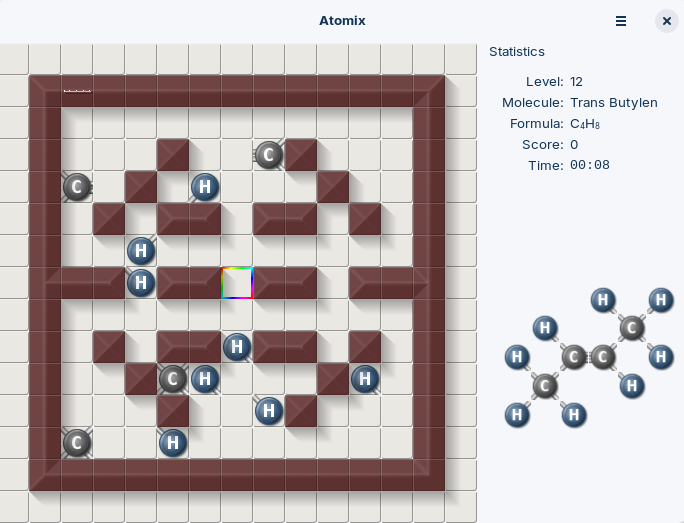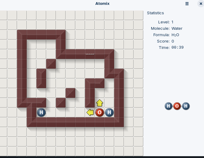 Atomix is a very simple sliding block tiling puzzle game, in which, the user has to slide the atoms to form the molecule given as a challenge.